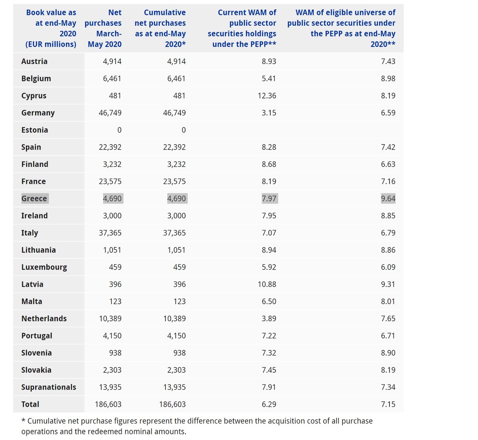 Το ενδιαφέρον εστιάζει στο προσωρινό πρόγραμμα αγοράς ομολόγων για τον κορωνοϊό, το PEPP (Pandemic Emergency Purchase programme) το οποίο ξεκίνησε το Μάρτιο και στο οποίο συμπεριελήφθη και η Ελλάδα. Οι αγορές ευρωπαικών κρατικών ομολόγων από την ΕΚΤ, κρατούν τις τιμές τους ψηλά και τις αποδόσεις τους χαμηλά, απορροφώντας τις κινήσεις πανικού επενδυτών που μπορεί να ξεφορτωθούν κάποια ευρωπαίκά ομόλογα, κυρίως της περιφέρειας.