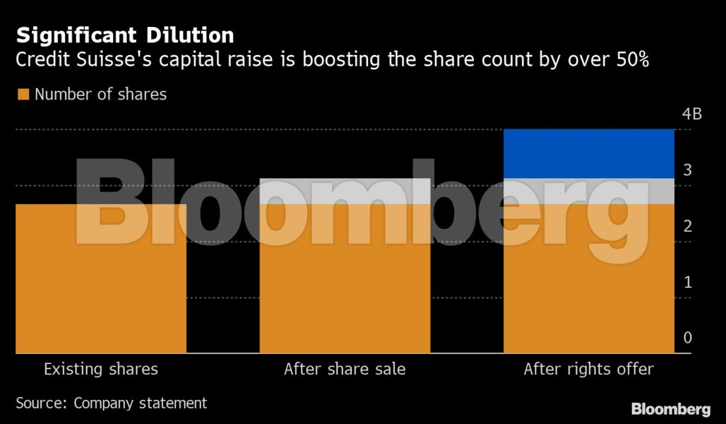 Την περασμένη εβδομάδα, οι μετοχές υποχώρησαν σε ιστορικό χαμηλό περίπου 2,67 ελβετικών φράγκων, ακριβώς πάνω από την τιμή των 2,52 φράγκων για δικαιώματα εγγραφής που πρόσφερε η Credit Suisse στους υφιστάμενους επενδυτές. Η τράπεζα είχε ορίσει την τιμή σε έκπτωση περίπου 32% στην αξία της μετοχής της μετά την παρουσίαση της στρατηγικής τον Οκτώβριο.