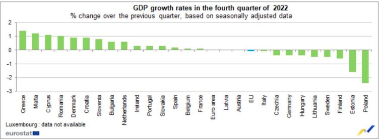 Όπως φαίνεται και από τον πίνακα της Eurostat, η Ελλάδα είχε τη μεγαλύτερη  ανάπτυξη σε τριμηνιαία βάση (+1,4%).  Στη δεύτερη και την τρίτη θέση η Μάλτα (+1,2%) και η Κύπρος (+1,1%). Πτώση του ΑΕΠ καταγράφηκε στην Πολωνία (-2,4%), την Εσθονία (-1,6%), και τη Φινλανδία (-0,6%).